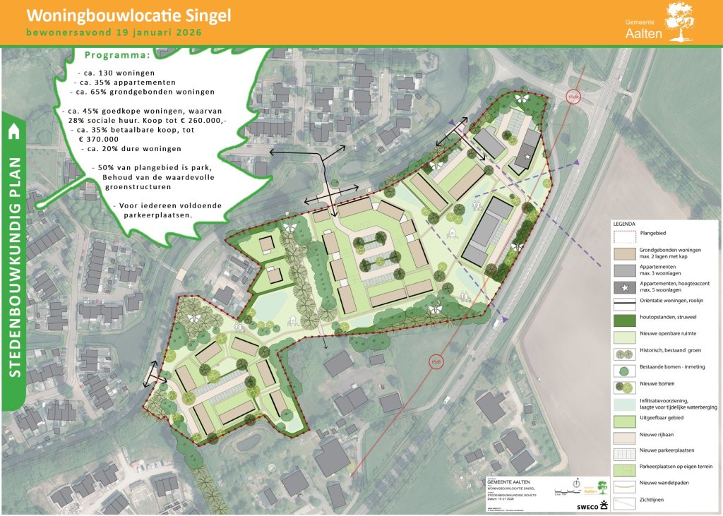 Op maandag 19 januari 2026 organiseerden we twee keer een bijeenkomst in het gemeentehuis in Aalten over de woningbouwplannen voor Singel 1 en 2. Tijdens deze bijeenkomst presenteerden en lichtten we het stedenbouwkundig plan toe voor de nieuwe woonwijk tussen de Singelweg en de Hamelandroute in Aalten.